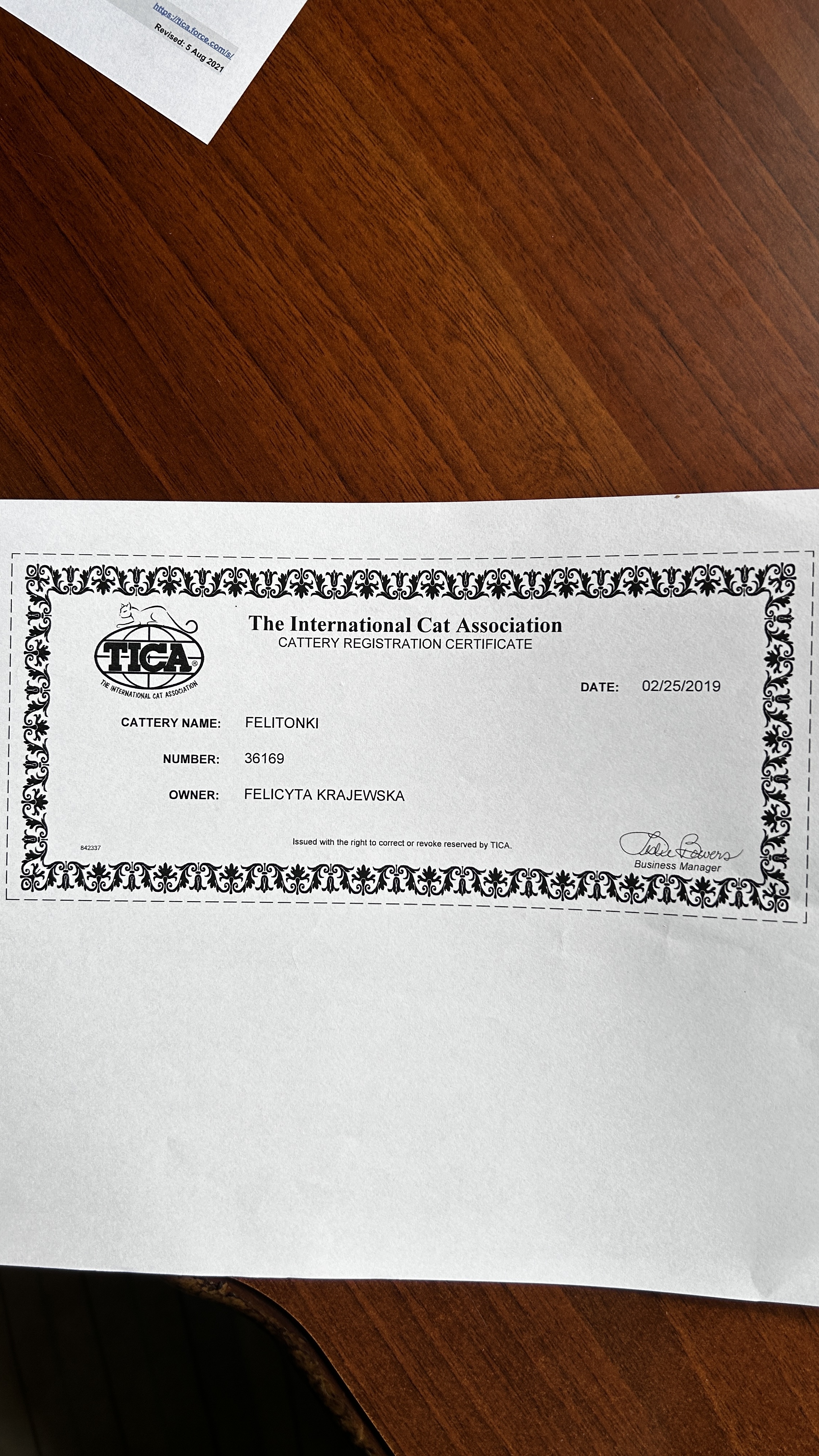Kocięta opuszczają hodowlę w wieku minimum 14 tygodni, po zabiegu kastracji, dwukrotnie zaszczepione, odrobaczone, zdrowe, zachipowane. Otrzymują książeczkę zdrowia, rodowód TICA, umowę sprzedaży oraz fajną wyprawkę, a przede wszystkim maksimum miłości i dobrego wychowania.