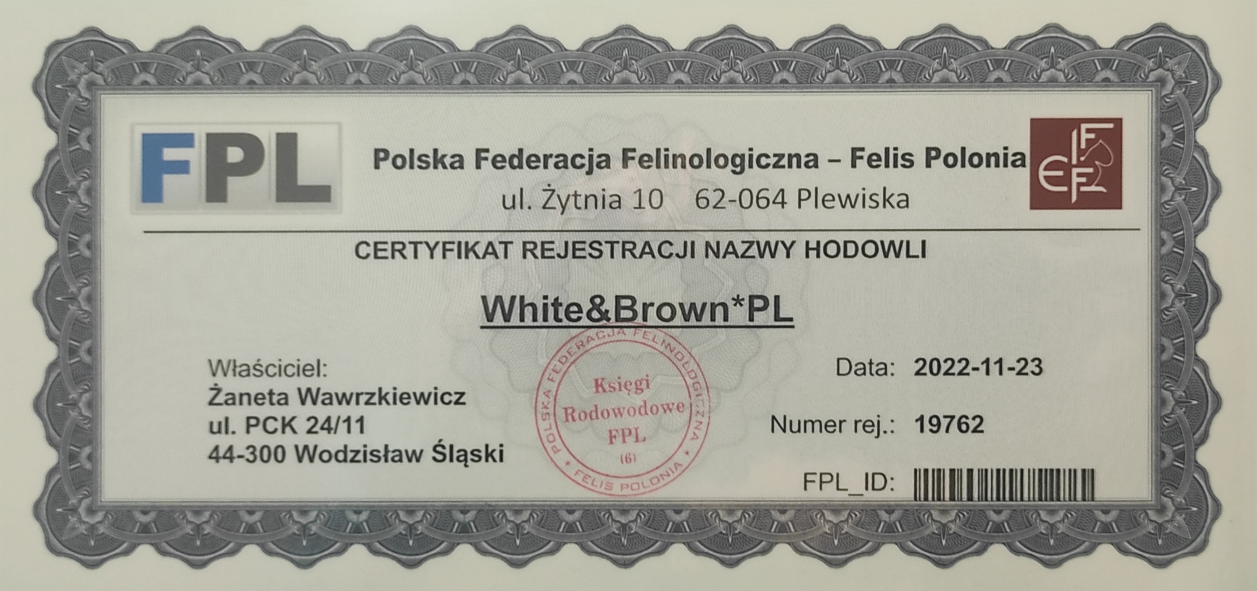 Na podstawie przes艂anych dokument贸w, nasz zesp贸艂 potwierdzi艂 偶e hodowla nale偶y do podanego przez ni膮 stowarzyszenia