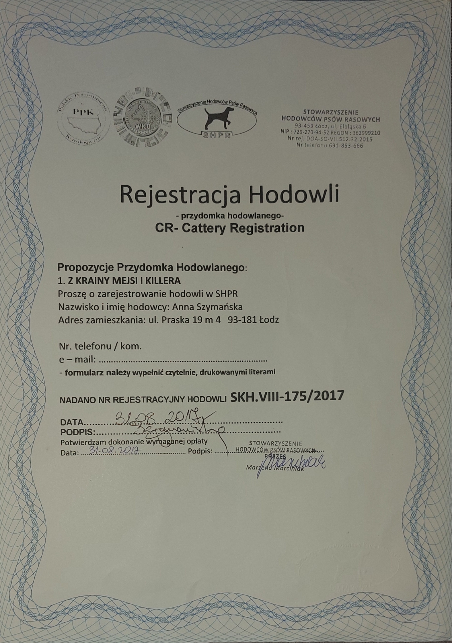 Na podstawie przes艂anych dokument贸w, nasz zesp贸艂 potwierdzi艂 偶e hodowla nale偶y do podanego przez ni膮 stowarzyszenia