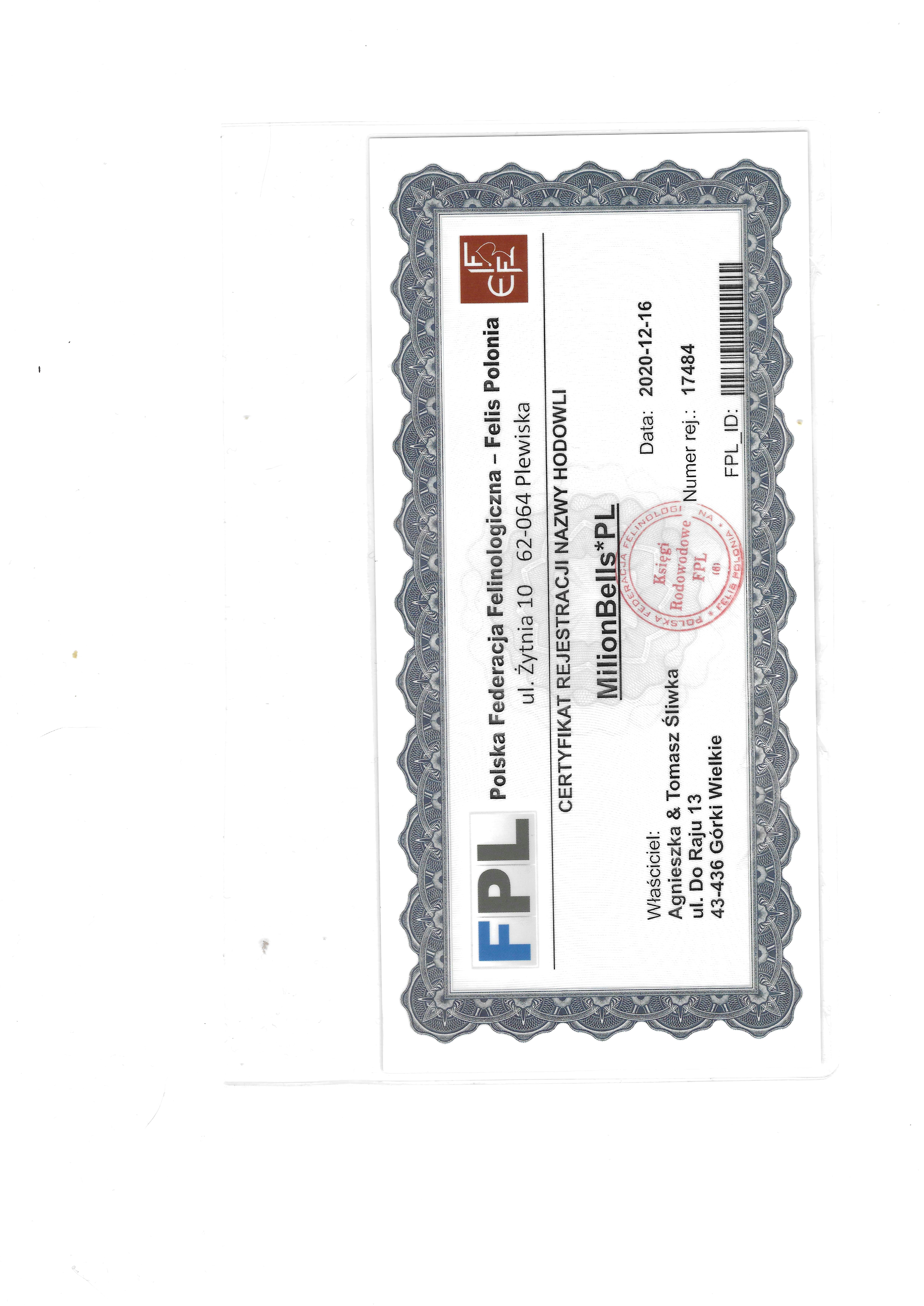 Na podstawie przes艂anych dokument贸w, nasz zesp贸艂 potwierdzi艂 偶e hodowla nale偶y do podanego przez ni膮 stowarzyszenia