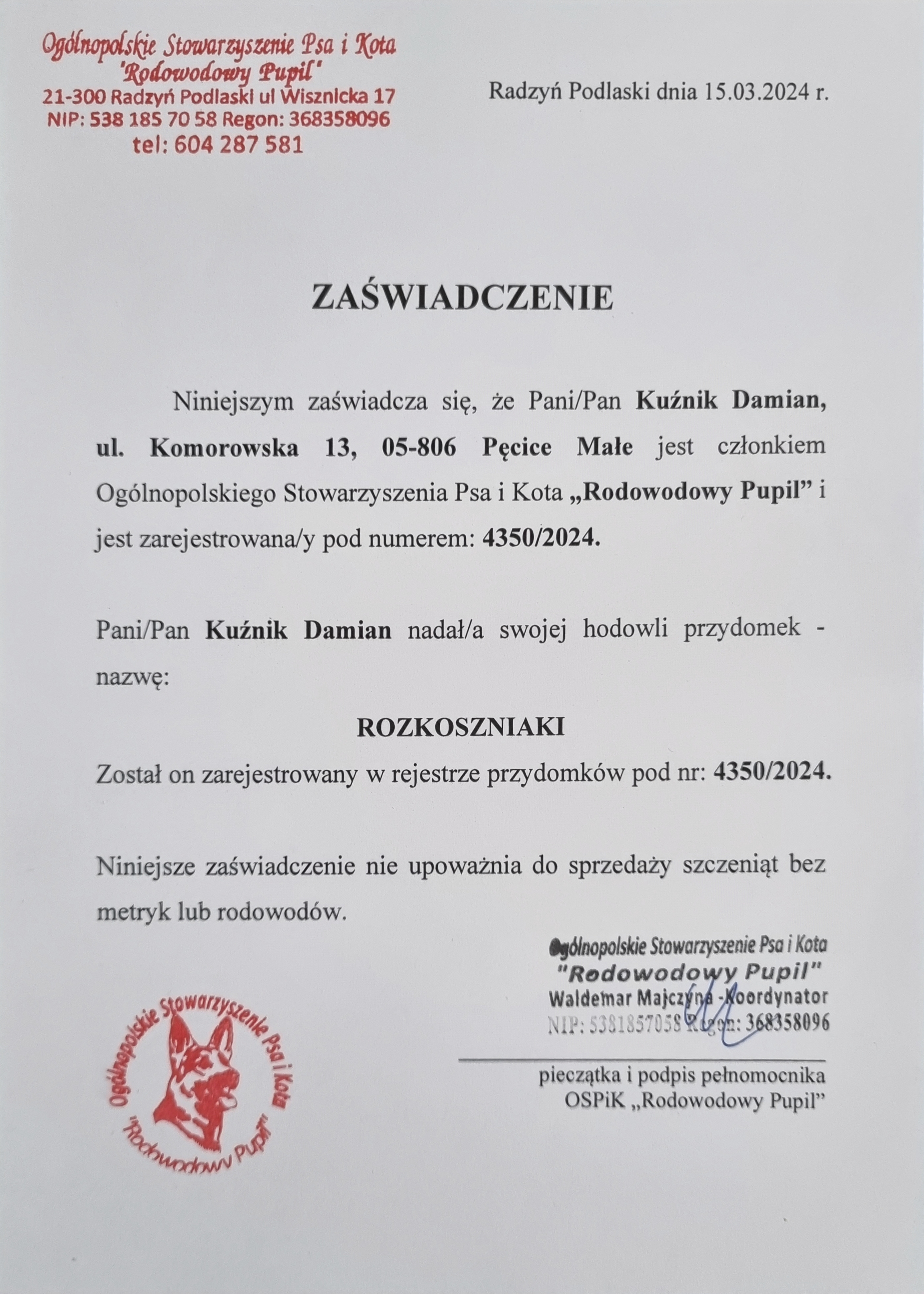 Na podstawie przes艂anych dokument贸w, nasz zesp贸艂 potwierdzi艂 偶e hodowla nale偶y do podanego przez ni膮 stowarzyszenia