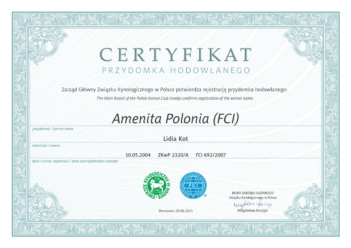 Hodowla podlega pod Mi臋dzynarodow膮 Federacje Kynologiczn膮 - FCI (poprzez Polskie ZKwP)