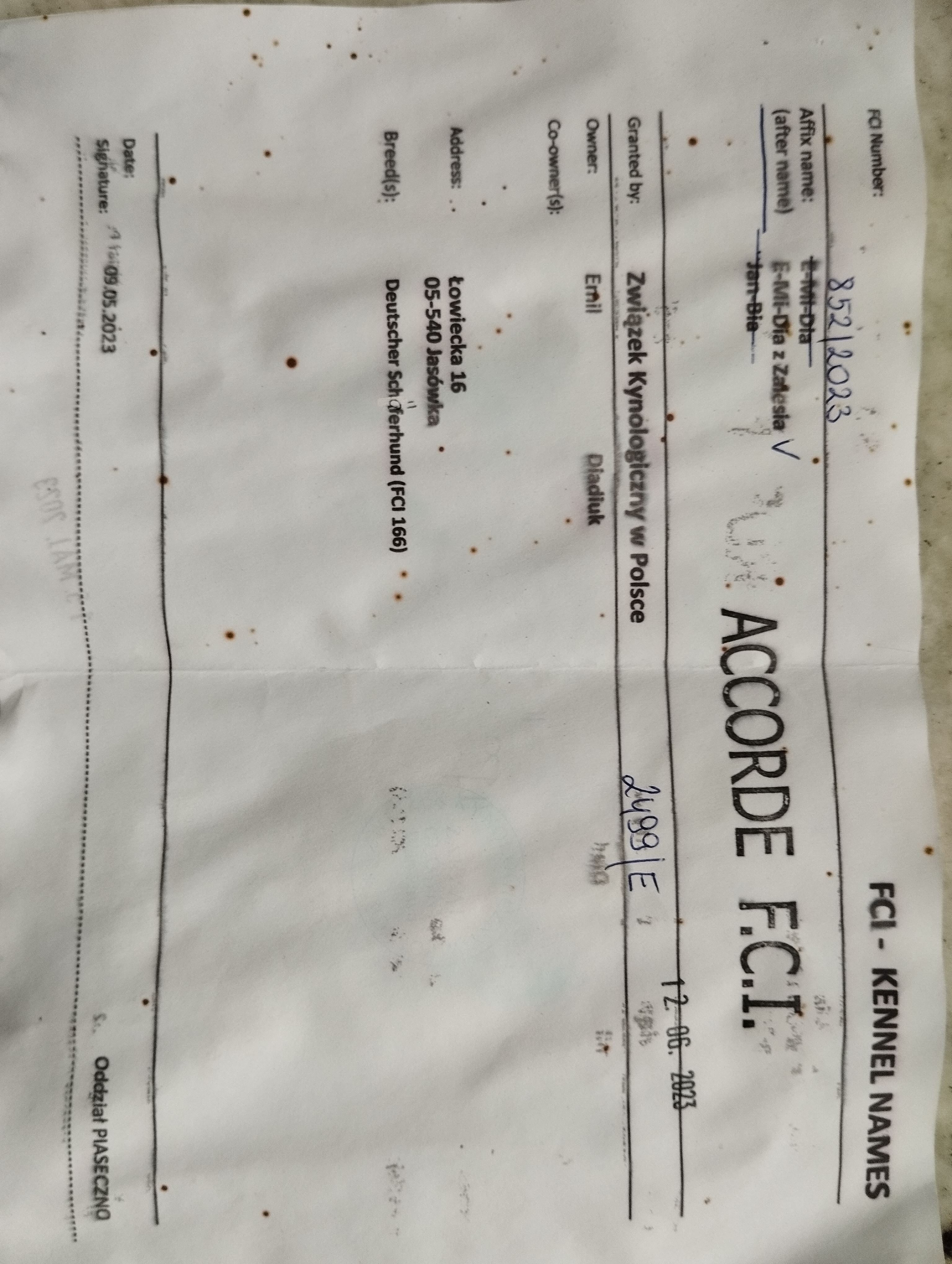 Na podstawie przes艂anych dokument贸w, nasz zesp贸艂 potwierdzi艂 偶e hodowla nale偶y do podanego przez ni膮 stowarzyszenia