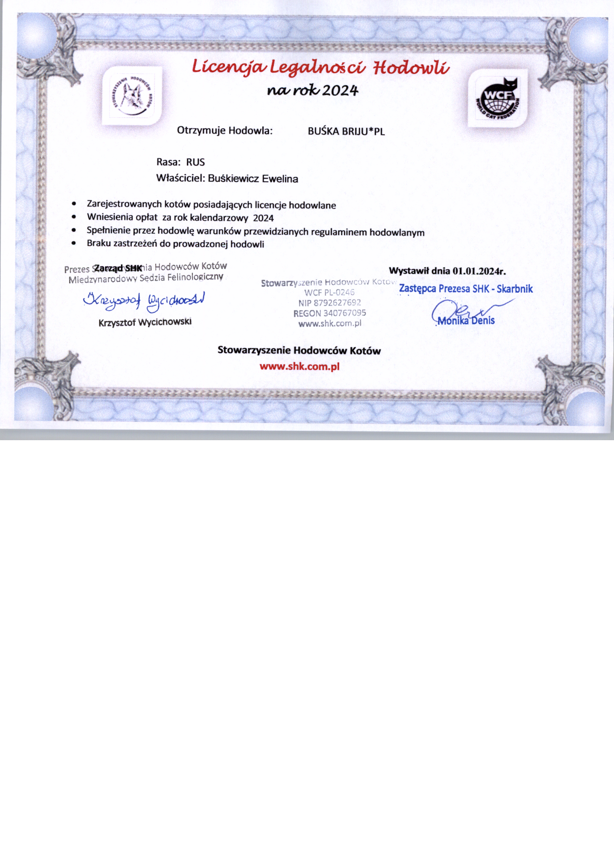 Na podstawie przes艂anych dokument贸w, nasz zesp贸艂 potwierdzi艂 偶e hodowla nale偶y do podanego przez ni膮 stowarzyszenia