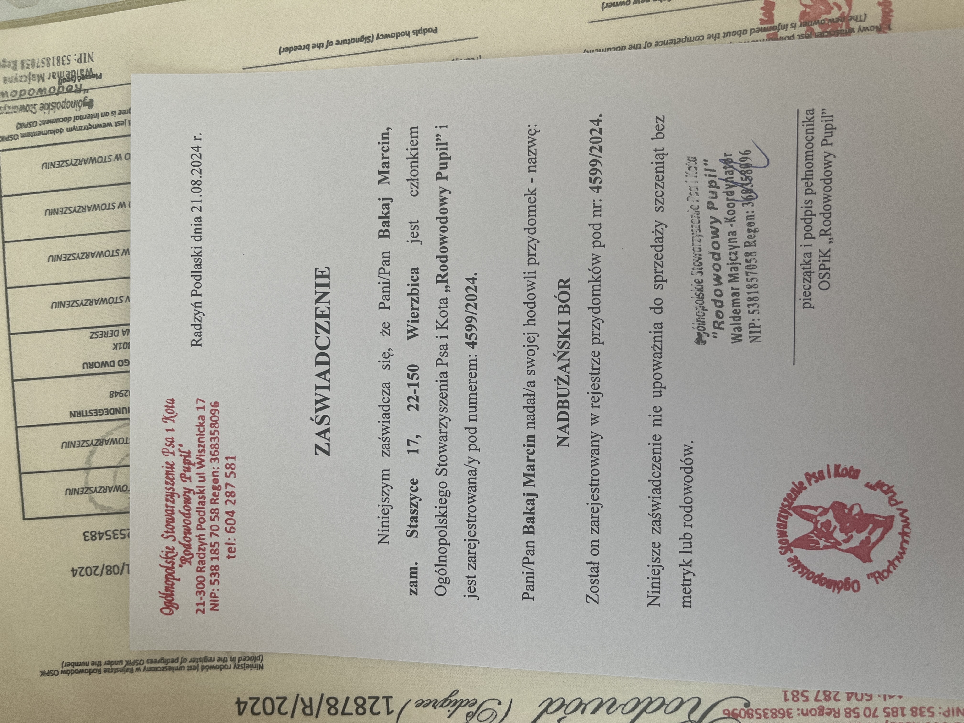 Na podstawie przes艂anych dokument贸w, nasz zesp贸艂 potwierdzi艂 偶e hodowla nale偶y do podanego przez ni膮 stowarzyszenia