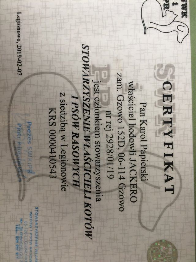 Na podstawie przes艂anych dokument贸w, nasz zesp贸艂 potwierdzi艂 偶e hodowla nale偶y do podanego przez ni膮 stowarzyszenia