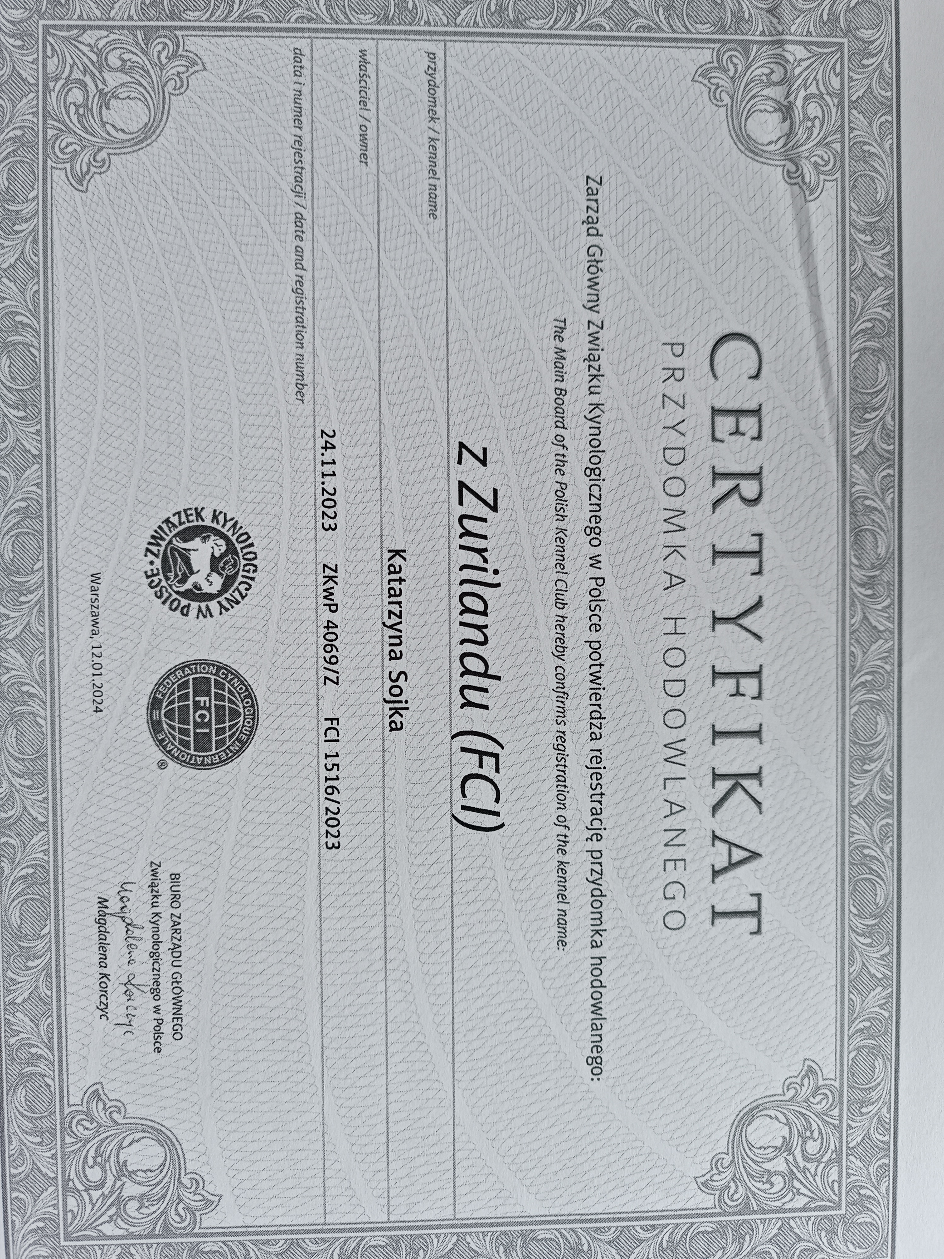 Na podstawie przes艂anych dokument贸w, nasz zesp贸艂 potwierdzi艂 偶e hodowla nale偶y do podanego przez ni膮 stowarzyszenia