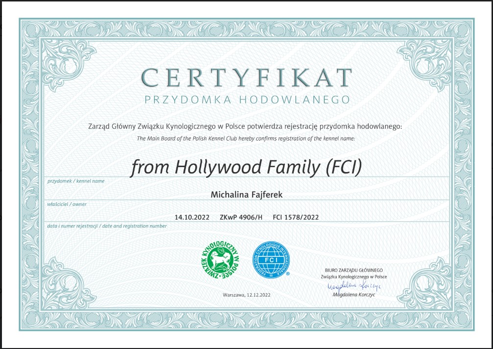 (Federation Cynologique Internationale) z siedzibą w Thuin w Belgii. Jesteśmy również członkiem Związku Kynologii w Polsce (ZKwP). Hodowlę prowadzimy z całą pełną miłością, troską, wiedzą oraz doświadczeniem które zdobywaliśmy przez całe nasze życie. Mamy nadzieję, że cała rodzinka Hollywood będzie zdrowa i silna ;) Serdecznie zapraszamy do kontaktu. Chętnie nawiązujemy nowe znajomości.