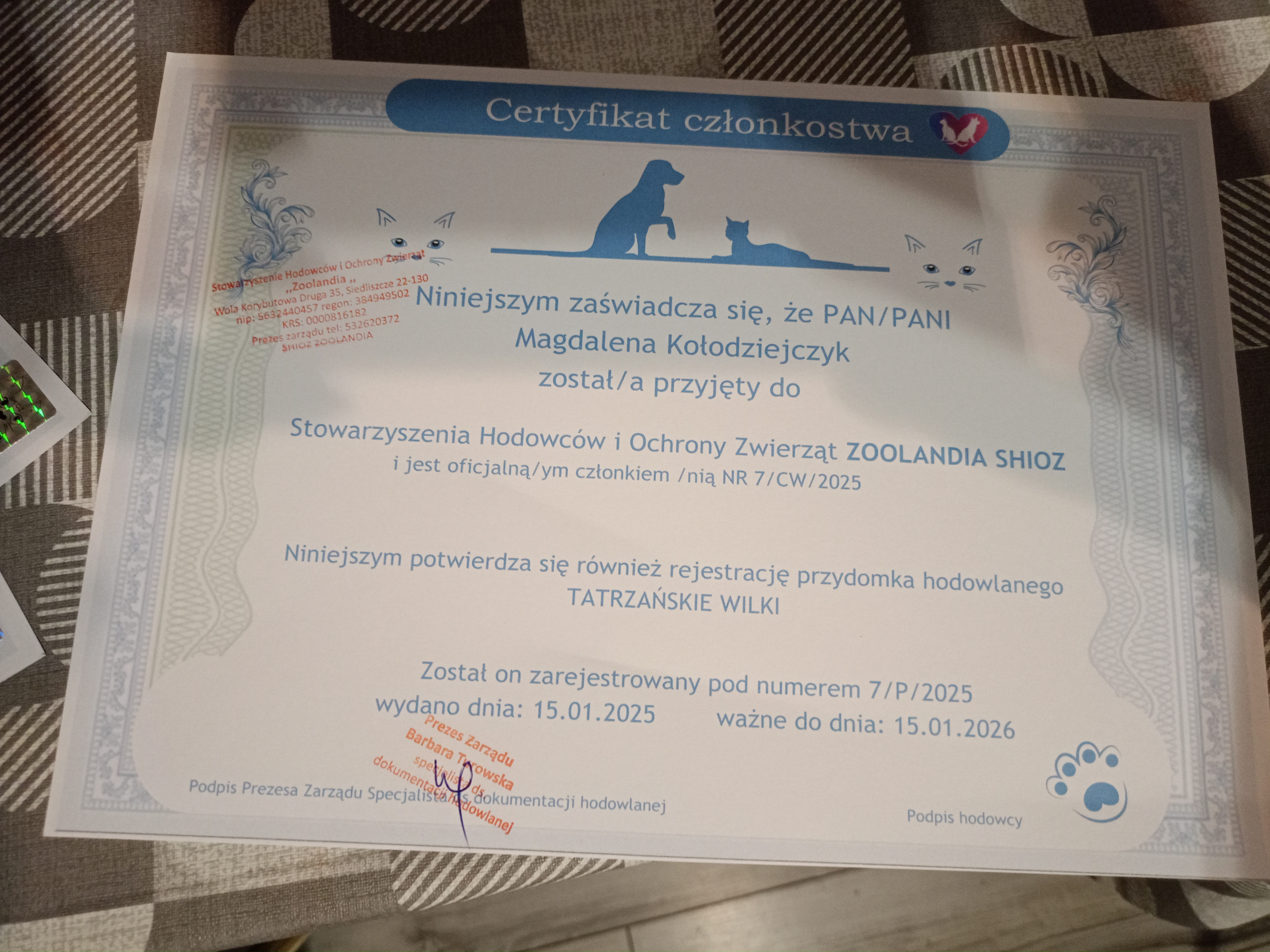 Na podstawie przes艂anych dokument贸w, nasz zesp贸艂 potwierdzi艂 偶e hodowla nale偶y do podanego przez ni膮 stowarzyszenia