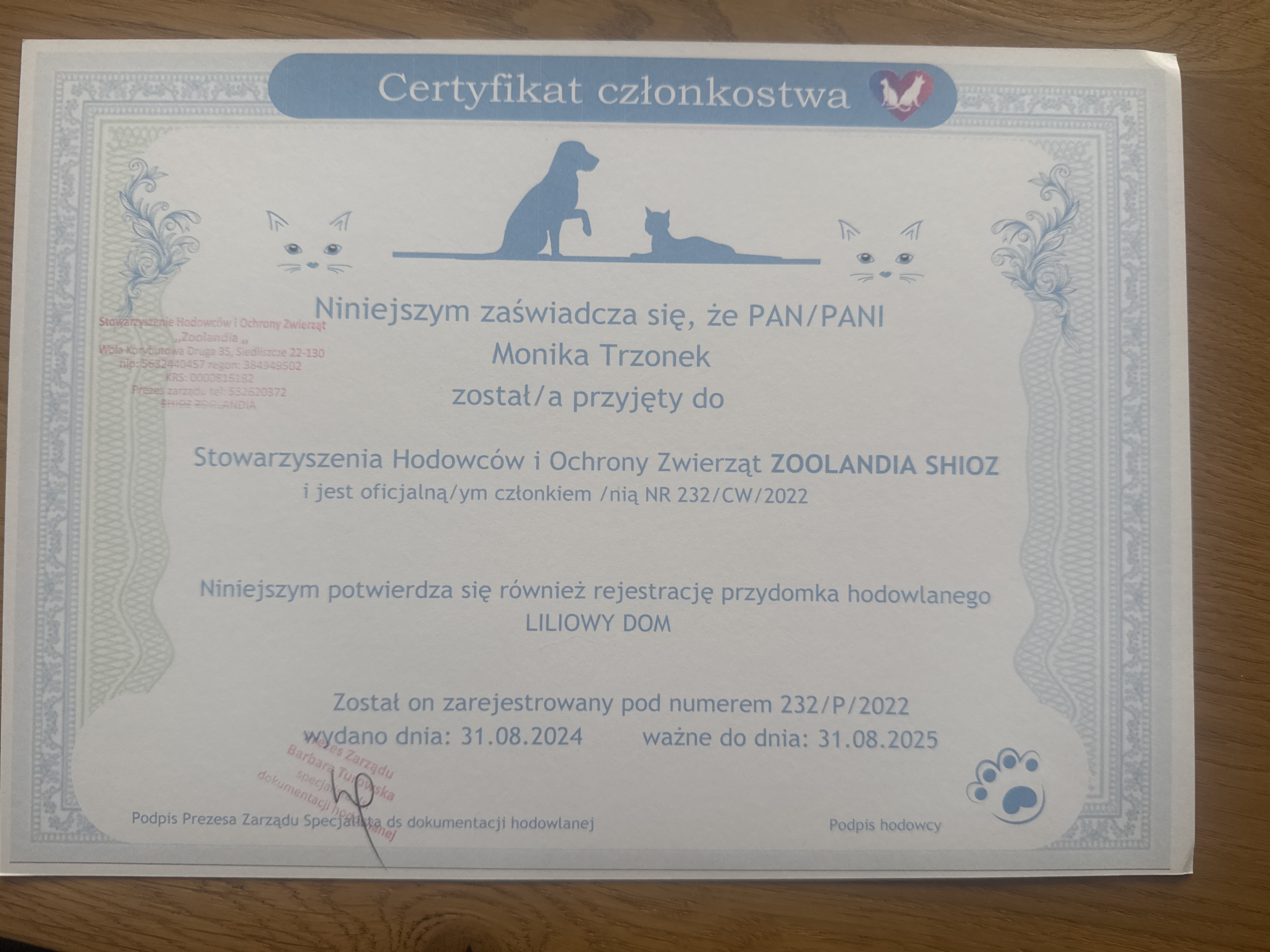 Na podstawie przes艂anych dokument贸w, nasz zesp贸艂 potwierdzi艂 偶e hodowla nale偶y do podanego przez ni膮 stowarzyszenia