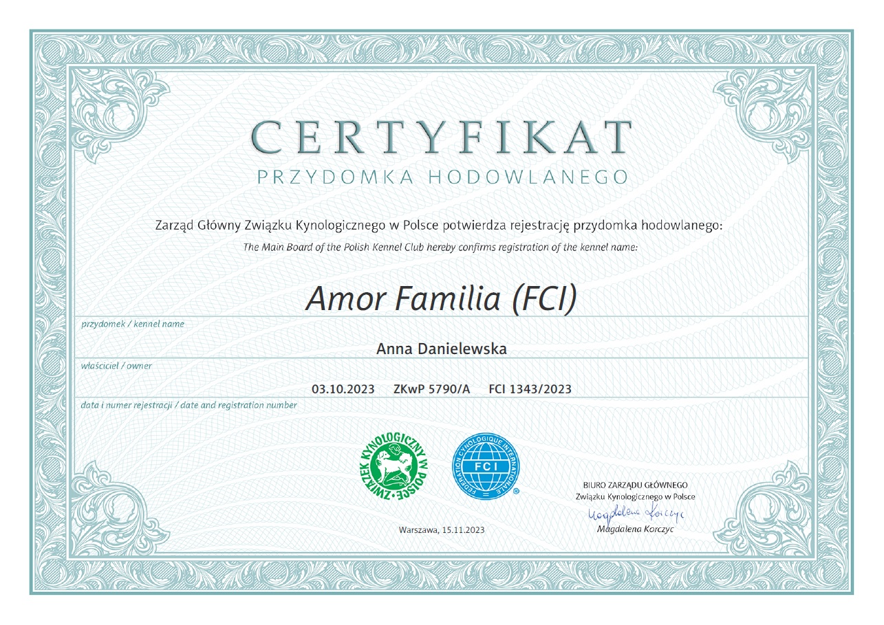 Amor Familia FCI to miejsce powstałe z miłości do psów rasy Lagotto Romagnolo. Jesteśmy hodowlą zrzeszoną w Związku Kynologicznym w Polsce (ZKwP) oddział Toruń, będącego członkiem Międzynarodowej Federacji Kynologocznej (FCI).