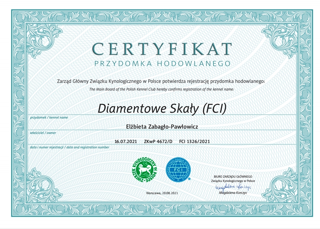 Hodowla podlega pod Mi臋dzynarodow膮 Federacje Kynologiczn膮 - FCI (poprzez Polskie ZKwP)