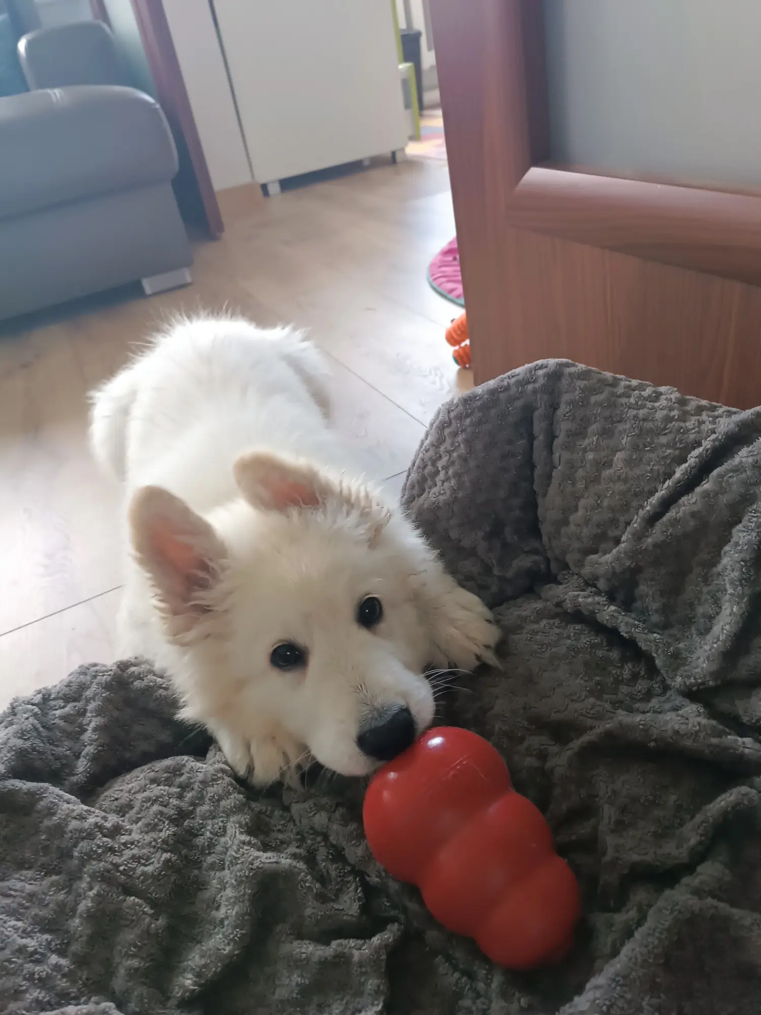Samiec jest duży, puchaty i ciekawski świata. Ładnie się rozwija, lubi zabawę z rodzeństwem, biegnie do człowieka, uwielbia pieszczoty. Dbamy o jego socjalizację i wczesną stymulację neurologiczną. Od pierwszych dni życia szczeniak przyzwyczajany jest do różnych bodźców, dźwięków, zapachów oraz kontaktu z ludźmi, dziećmi i innymi zwierzętami. Dzięki temu będzie gotowy do łatwej adaptacji w nowym domu