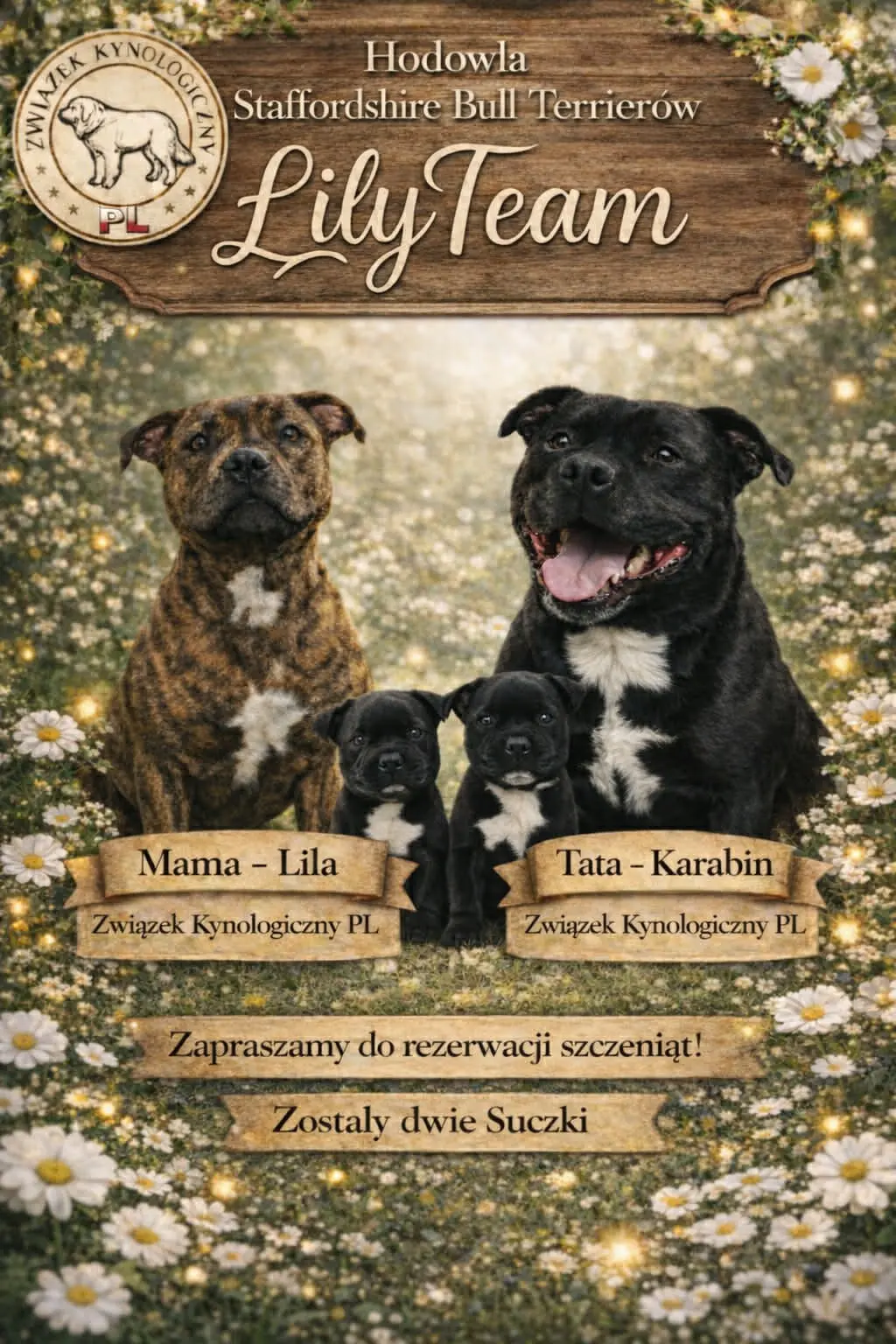 SZCZENIAKI STAFFORDSHIRE BULL TERRIER – LILA TEAM Z radością ogłaszamy, że nasza suczka Lila urodziła zdrowe i pełne energii maluszki 16 grudnia...