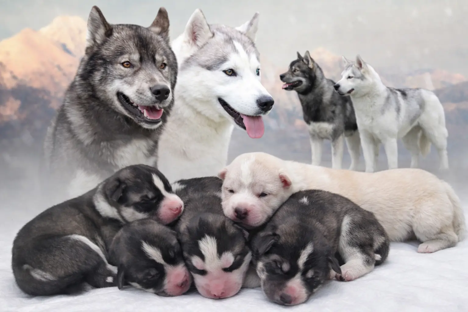 Mama szczeniąt to srebrno - biała sunia: Wild Tayga Silvery Glow FCI, córka naszej Numees. Jest to wyjątkowo czarująca suka hodowlana. Elegancka, o świetnej budowie. Posiada dość ciekawy rodowód, wielu utytułowanych przodków oraz tak cenione przydomki jak: Snowmist’s, Innisfree’s, Kristari's, Karnovanda's, De Ciukci. Bardzo spokojna i przyjazna dla ludzi. W domu grzeczna, nie niszczy, nie wyje. Niezwykle inteligentna i karna. Ma na swoim koncie tytuł Championa Polski Szczeniąt, Championa Polski Młodzieży i zaczęty dorosły Championat Polski. Profil DNA.