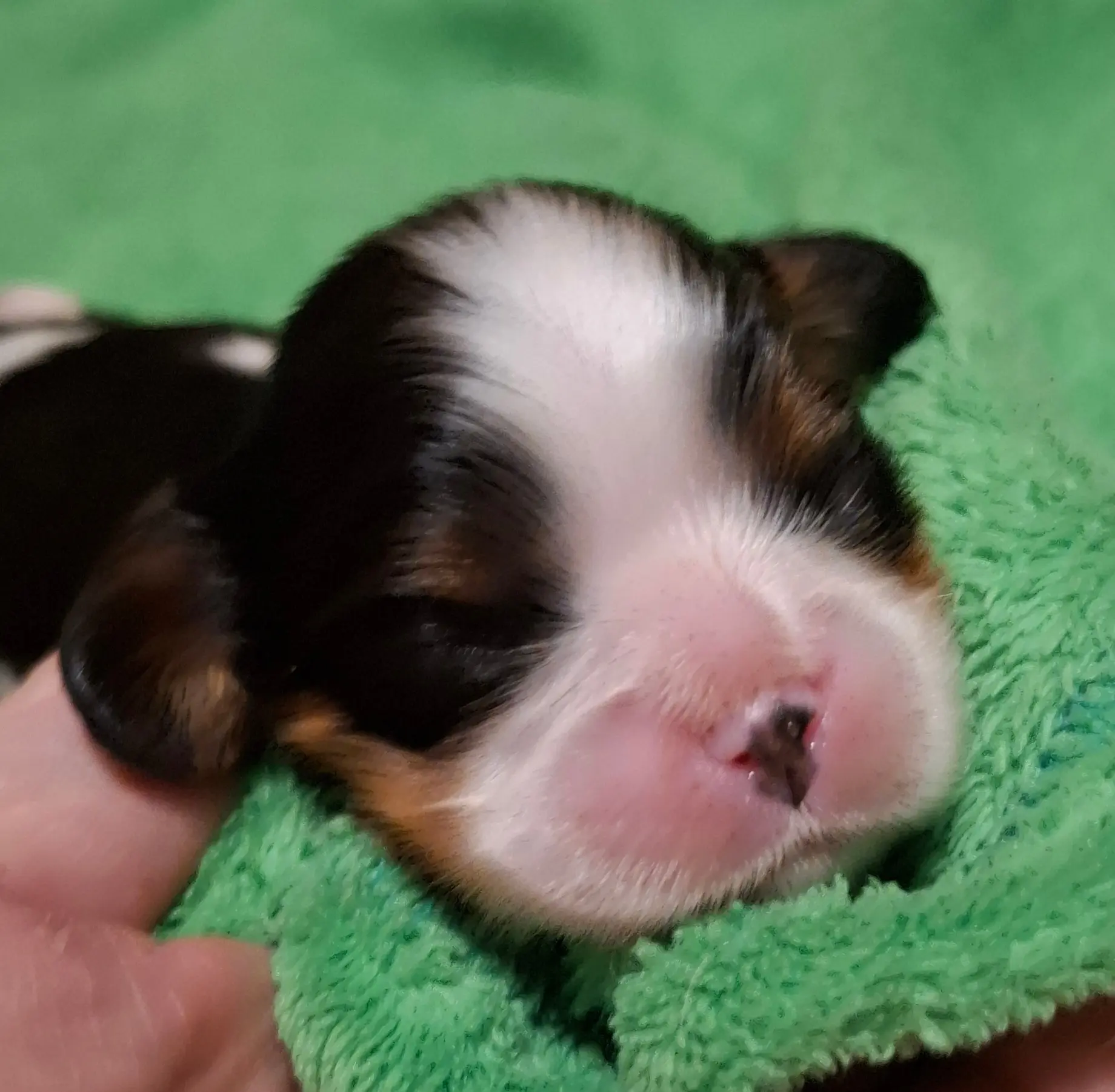 Za nowym domkiem rozgląda się tricolorowy piesek ur. 15 marca 2026